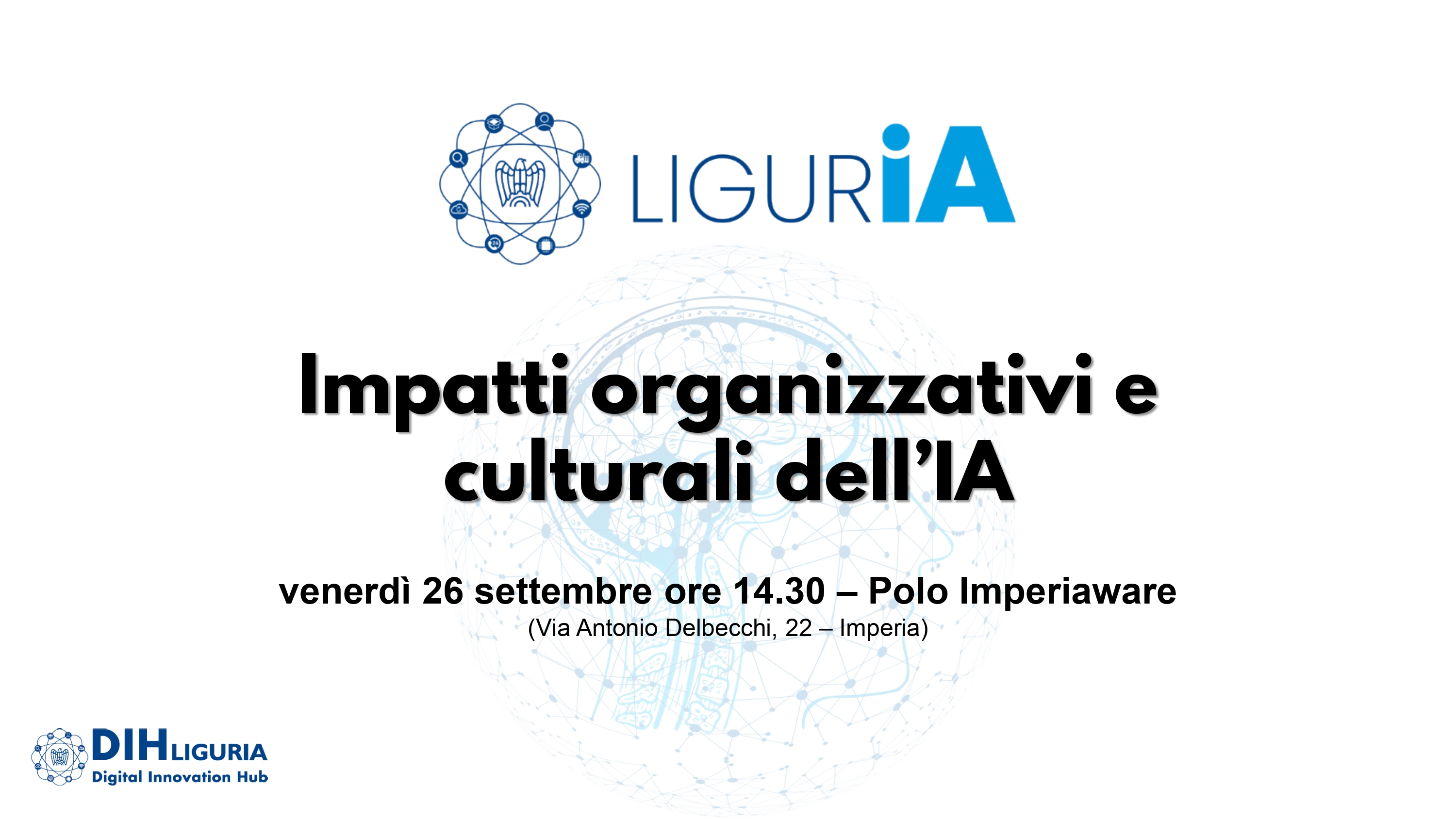 Appuntamento in presenza, ad Imperia, venerdì 26 settembre ore 14:30 presso il Polo Imperiaware (Via Antonio Delbecchi 22), oppure da remoto.